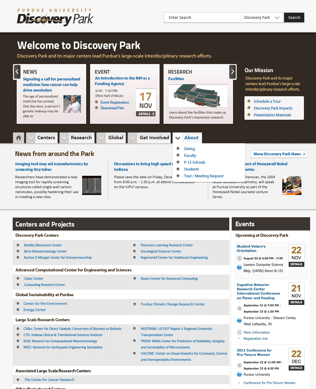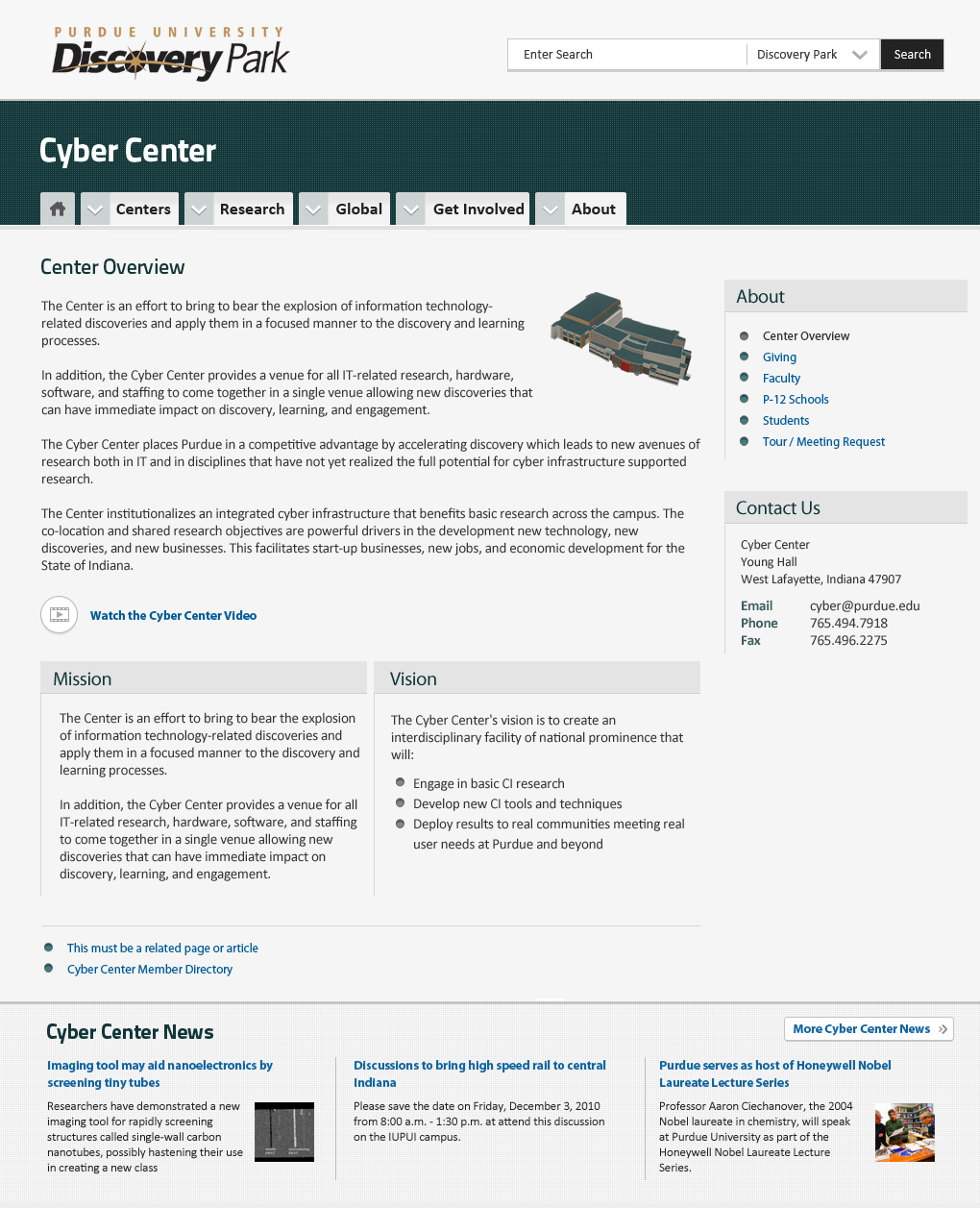 In addition campus-wide projects, most of us maintained additional responsibilities with departments around campus. Mine was overseeing the online presence for Discovery Park, the research arm of the university. This was a mini-campus within Purdue where several new centers were constructed for nanotechnology, bioscience, cancer research, earthquake prediction, and other groundbreaking projects. I met regularly with representatives of each center to discuss ways to highlight research and upcoming events. During this time, we would go onto launch over 40 center sites hosted across Discovery Park and roll out a content management system to maintain them all. Below shows a landing page design for Discovery Park along with an themed template for the Cyber Center.