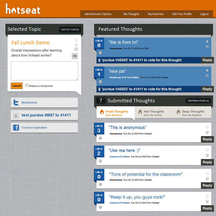 Two of the classroom applications I designed for our team were Hotseat and Mixable. These were both designed to be used with or during class and deployed across the university, available to all students. Hotseat was used in large lectures to field answers and discussion in realtime - this allowed topics to be voted on or responded to during a lecture as well as through social media. The other application, Mixable, used individual course registration to pair students with their classmates and instructors throughout the semester. Both of these would go onto be selected as some of the top classroom innovations of the year and highlighted in Campus Technology magazine.