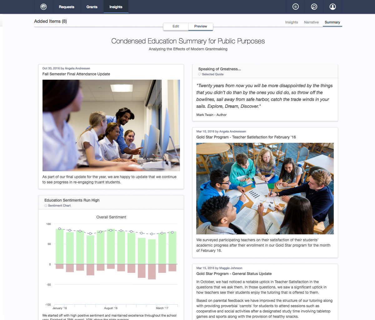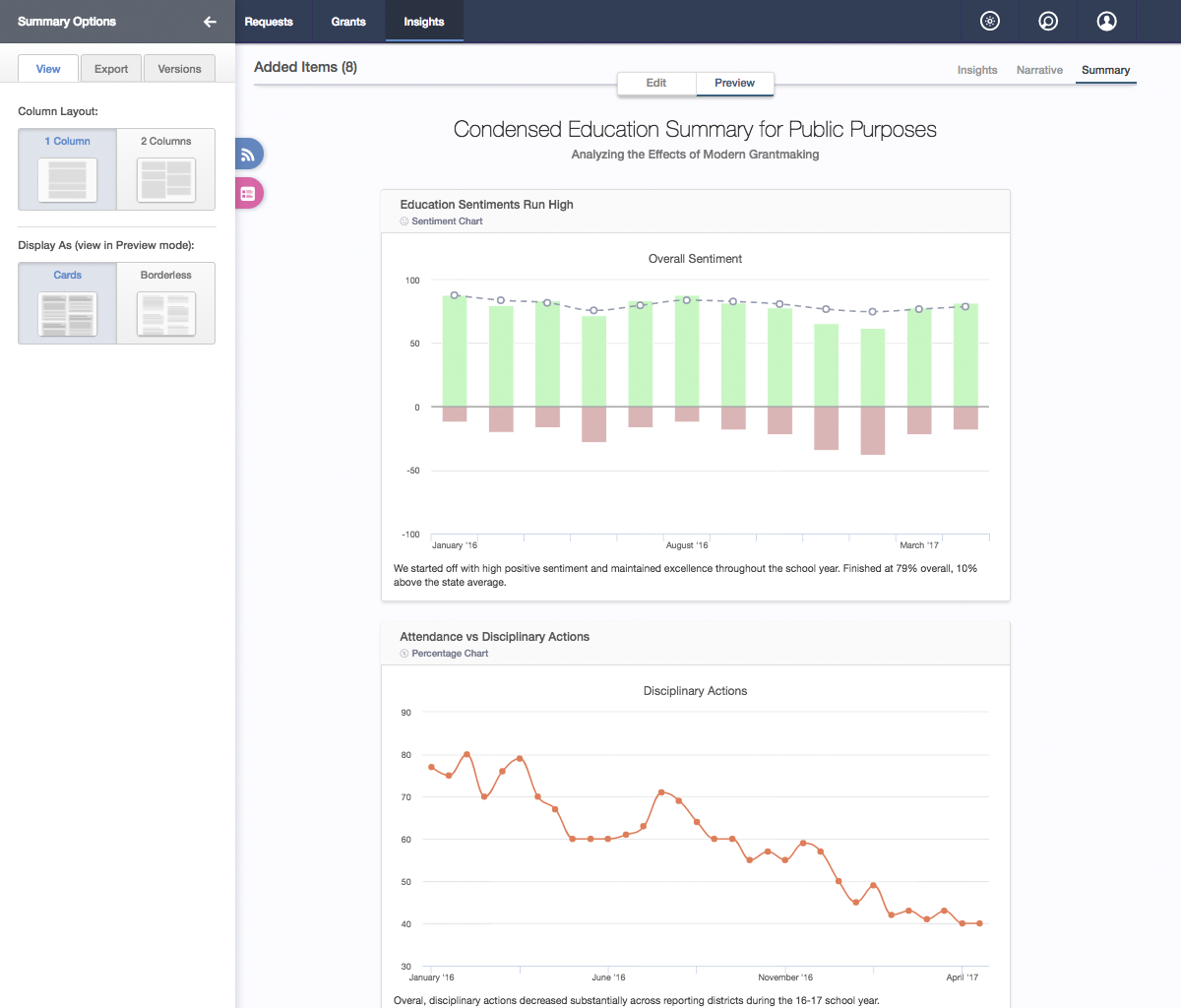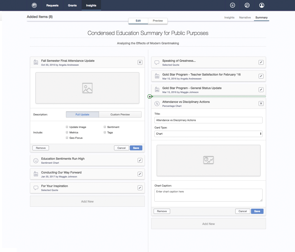With the tools available to record, connect, and visualize updates, there was still a big piece remaining - How were foundations, non-profits, and others going to make use of the data outside of our sandbox? We put together a summary builder to demonstrate some options for exporting collections of insights and narratives, along with adding text and images to tie it all together. Any chart or narrative could be captured and added to a summary where the arrangement could be configured. The summary could be shared with another editor to make changes, or as an exportable pdf or document. This allowed for collaboration on works in progress along with a source of charting and narrative for reports submitted during the course of a grant.