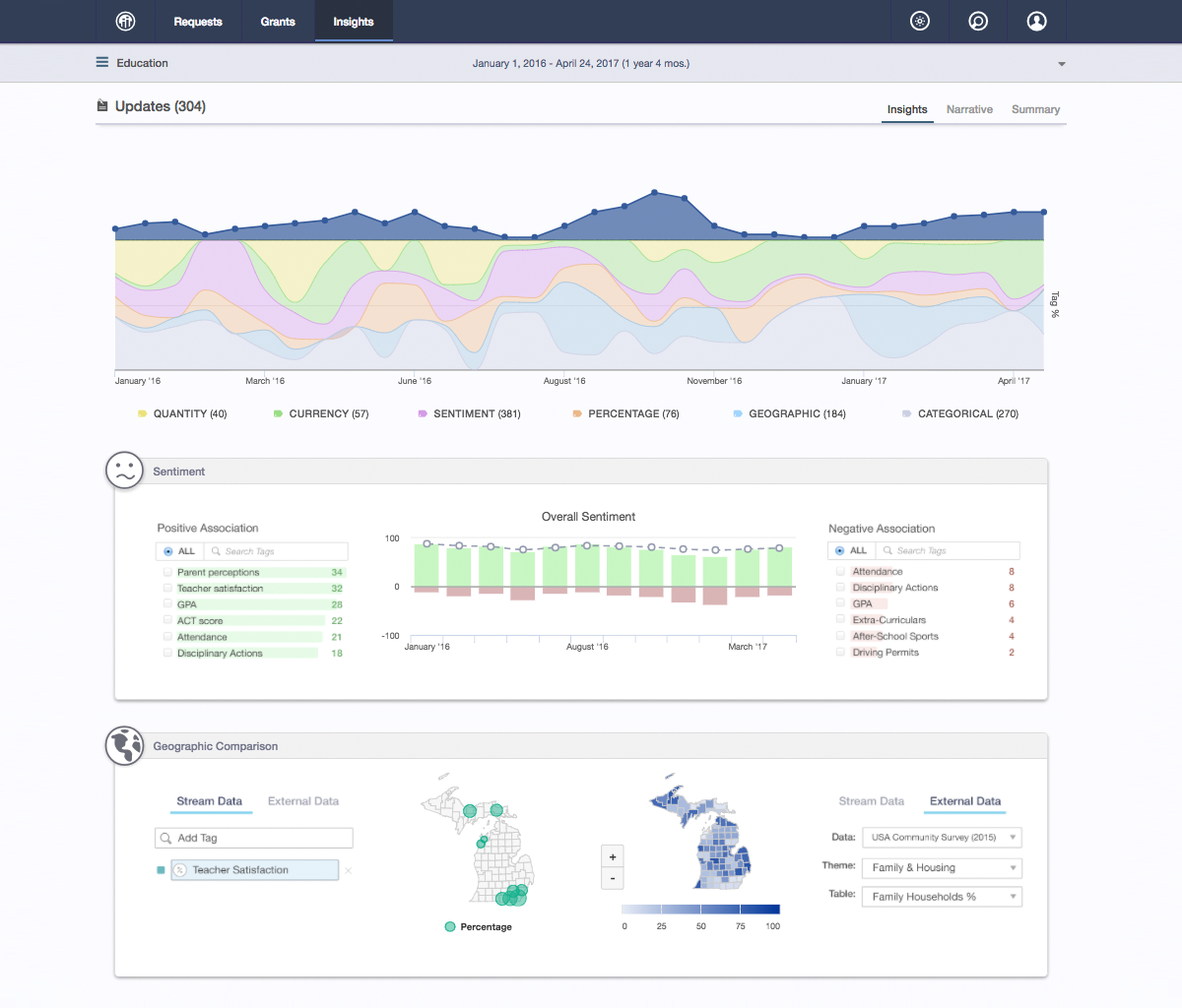 Using a loosely coupled set of metrics, we could group grants according to program areas, initiatives, and location and pull out common data for comparison. This framework was designed to be flexible so that taxonomy could be layered in separate or adjusted later for other types of measurements. Having a rich history of constructing reports for foundations, we started with hard metrics like quantity, percentage, currency, geography, and subjective ones like sentiment, category, and narrative.