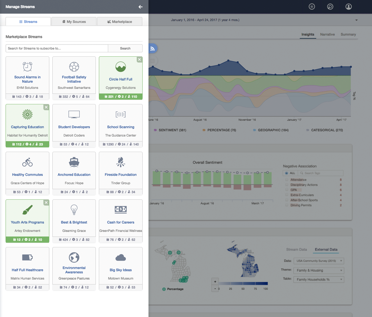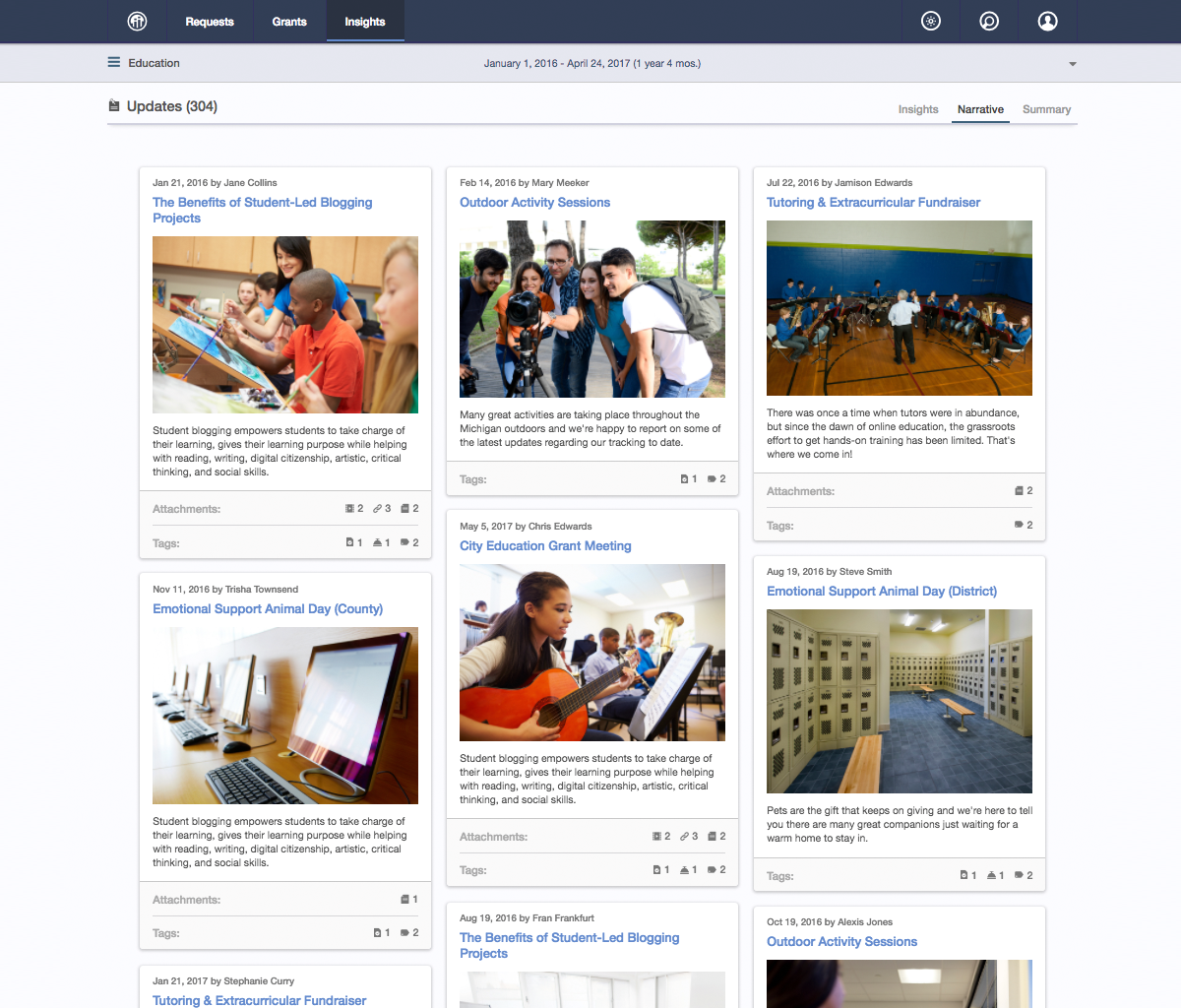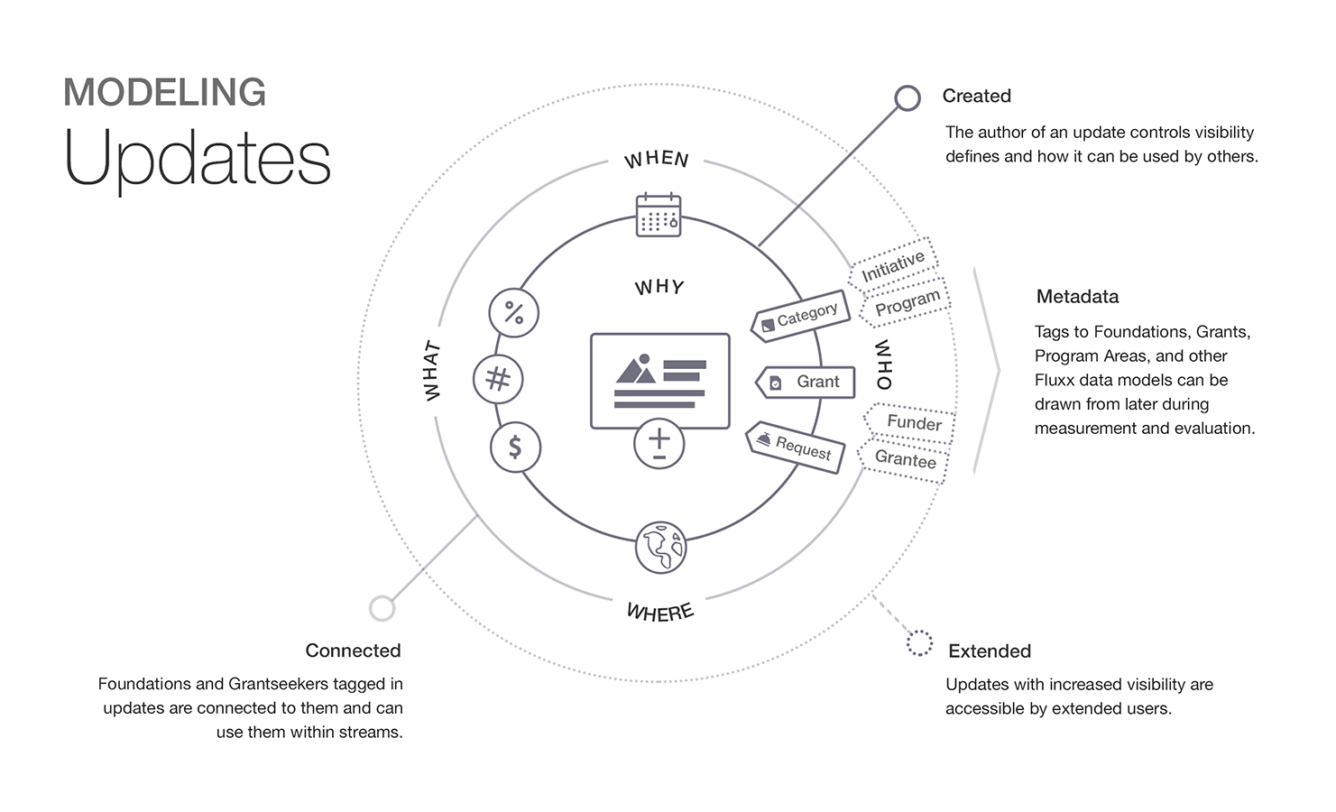 Our application was already being used to organize reports and other documentation for each grant. While useful for foundations, there was still a gap in how grantees could share updates with foundations along with tracking events and activities of their own. Updates were built around tagging grants and categories with loosely coupled metrics of sentiment, currency, quantity, percentages, and geography. The grants were linked to foundations who had placed them into program areas, and the metrics could be specified or mapped by the foundations to their own sets of data. This gave the non-profits the tools to provide results for work which could be mapped at a later time to the foundations initiatives.