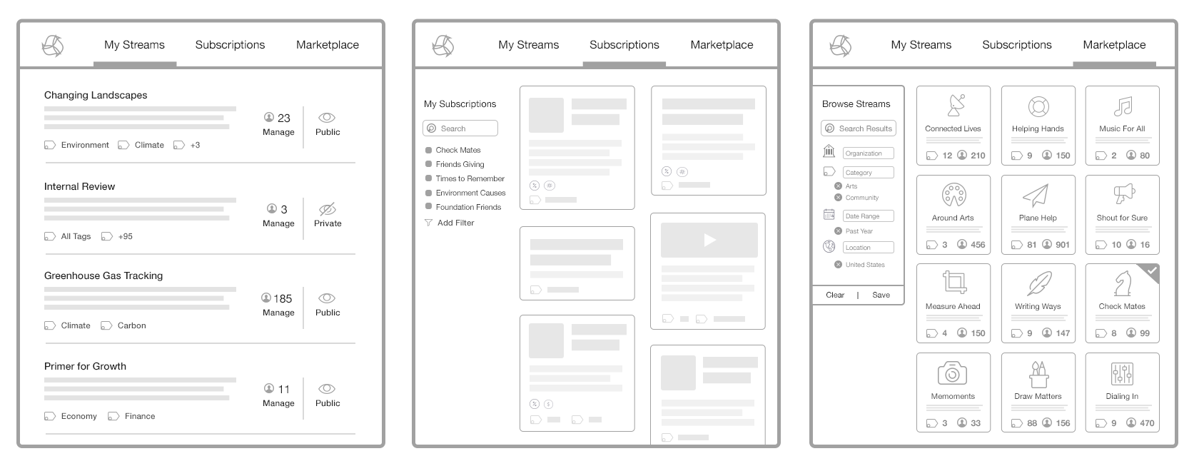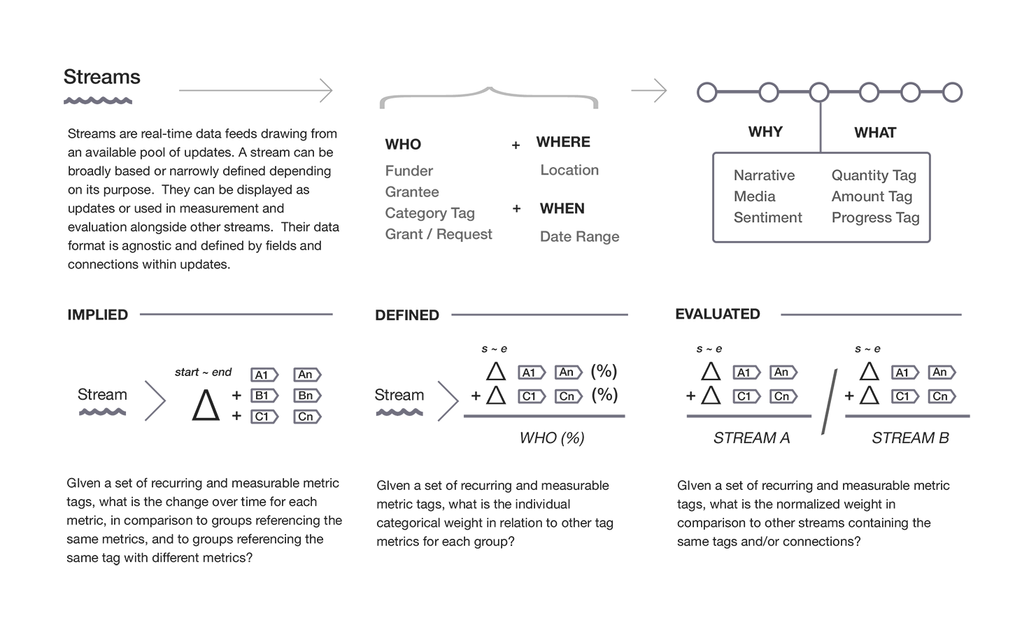 Capturing insights from metrics is one of the ways we saw impact being inferred from the product. In addition to preserving the underlying narrative, these insights could be created ad-hoc and include outside data relevant to the sample size, rather than forcing the measurements into a pre-determined system prone to change later on. For instance, across grants related to air quality, one could extract a yearly carbon measurement quantity. That metric/tag combination would connect to the grant and (by extension) the foundation funding the work. While the foundation could request the specific measurement, they could also evaluate metrics implicitly and weigh them separately, such as by funding amount. For added context, other sources could be shown such as funding by location or similar air quality measurements.