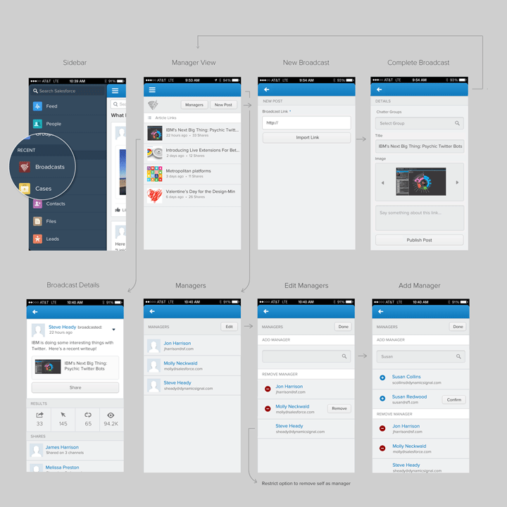 The mobile web conversion worked especially well when importing webviews into other native apps. This was largely the case when working on the integration for Salesforce Chatter. For the manager case, we focused on broadcasting and reviewing content. For users, we looked at connecting accounts, browsing streams, and reviewing activity. Both of these flows were piped through the Chatter app using a combination of native components and mobile web views. This offered an alternative view of our existing web product and another example of the interoperability of the platform.