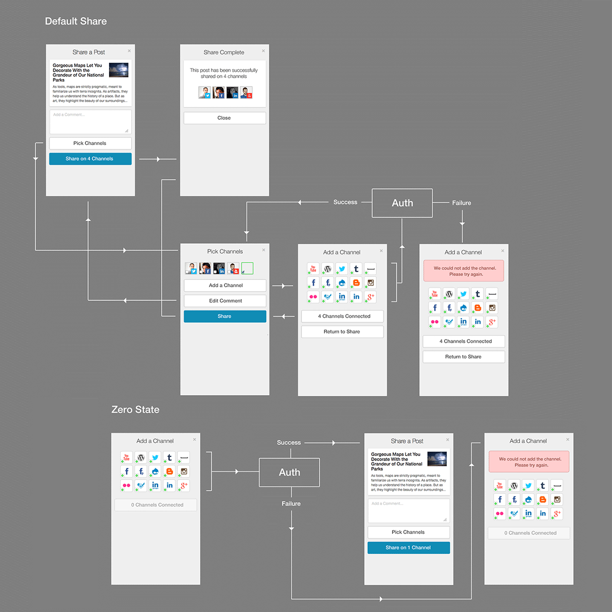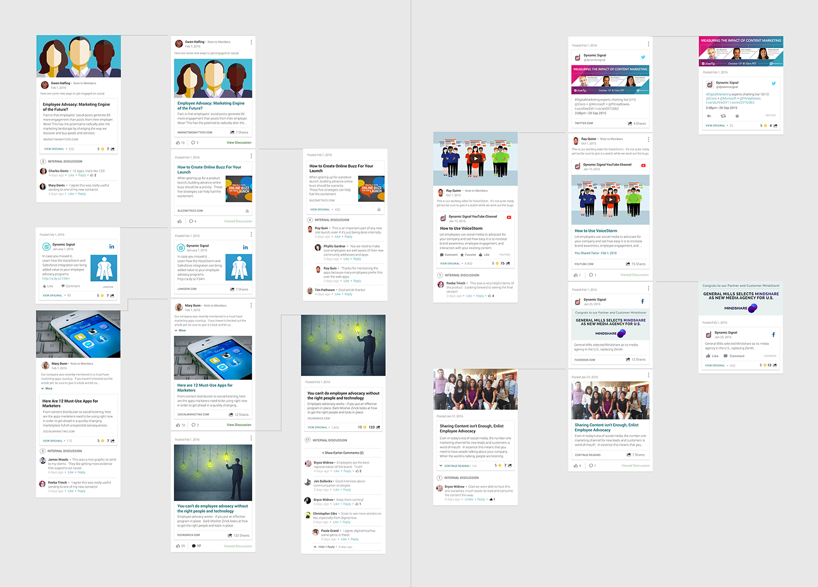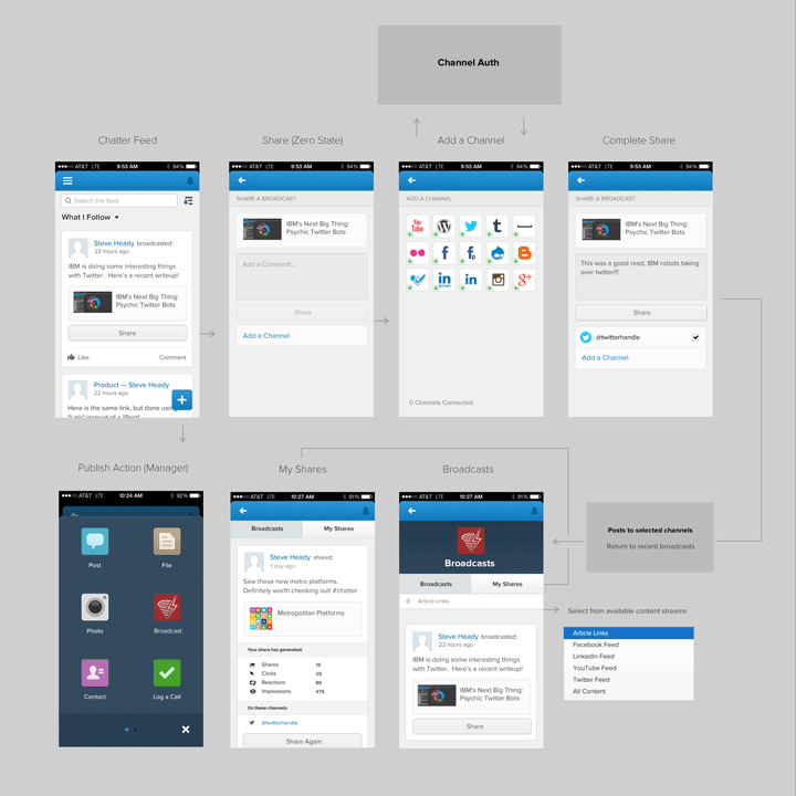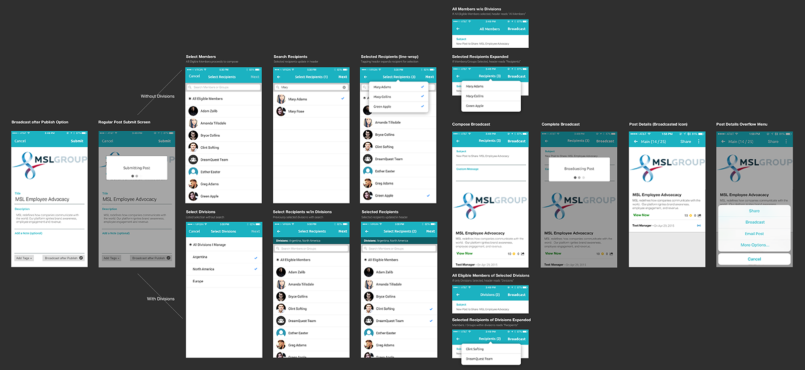 For our early native application, design used multi-step flows and detailed spec mockups. The long-term maintenance, templating, and documentation of all features on a configurable platform quickly added to the time. Below you’ll see a basic flow for a broadcast feature in two different configurations along with a feed/detail view with different types of post types.