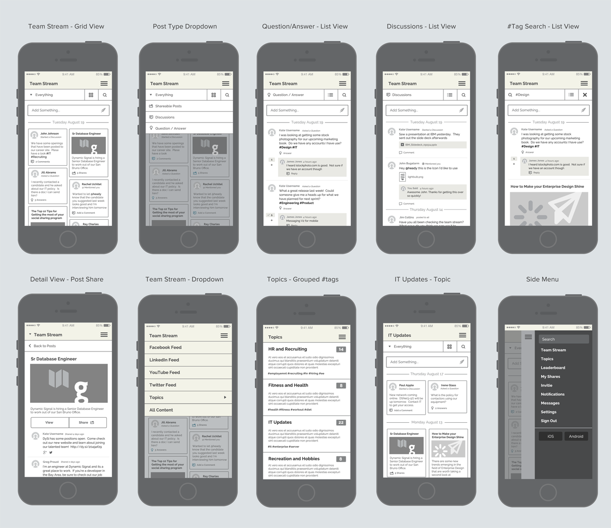 There were some obvious benefits a native application would bring to our product including deep linking from web, single sign-in, remote link overlays, and an environment exclusive to teams already on the platform. Metrics such as daily actives, email clickthroughs, and content sharing were utilized when evaluating our approach relative to web. Below shows some wireframes created to show topical amongst teams.