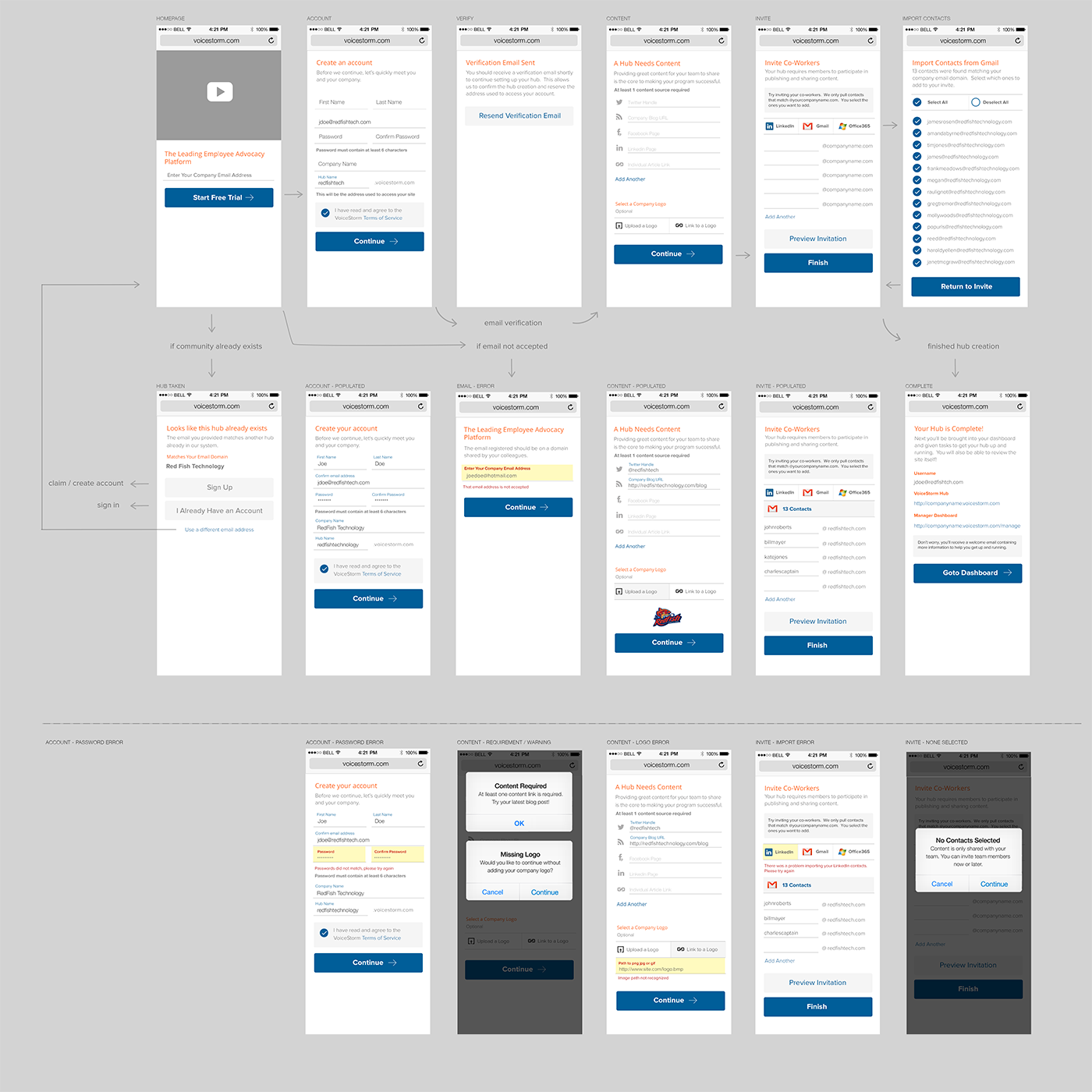 As part of the transition from desktop, we added some baseline media queries for landing pages, dashboards, and detail pages. Oftentimes users receiving links would access them from mobile web in a signed out state. Our first touchpoint with them would be either going through login or browsing content in order to prompt a signup. Below shows two of these common flows for creating new communities and setting up connections on existing sites.
