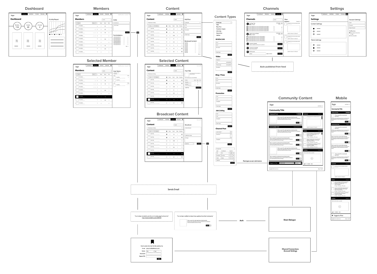 The wireframe below outlines an early version of this particular CMS across sections of dashboard, members, content, channels, and settings. It also showed the overlap between private and public views as content is moved through the system. Our first version was based on this hierarchy.