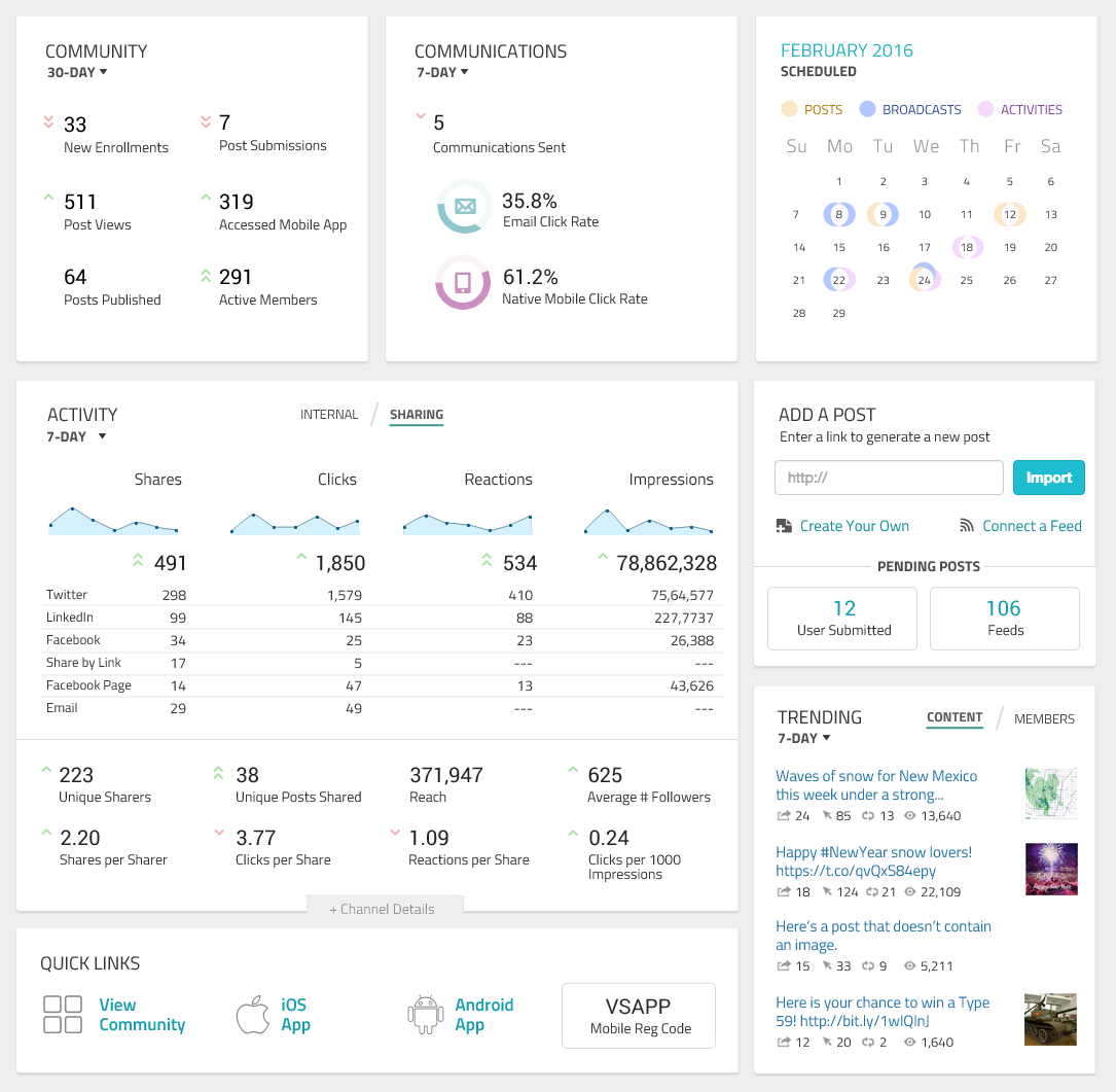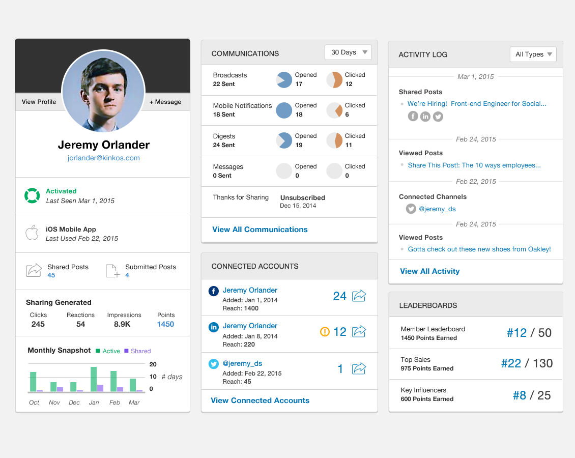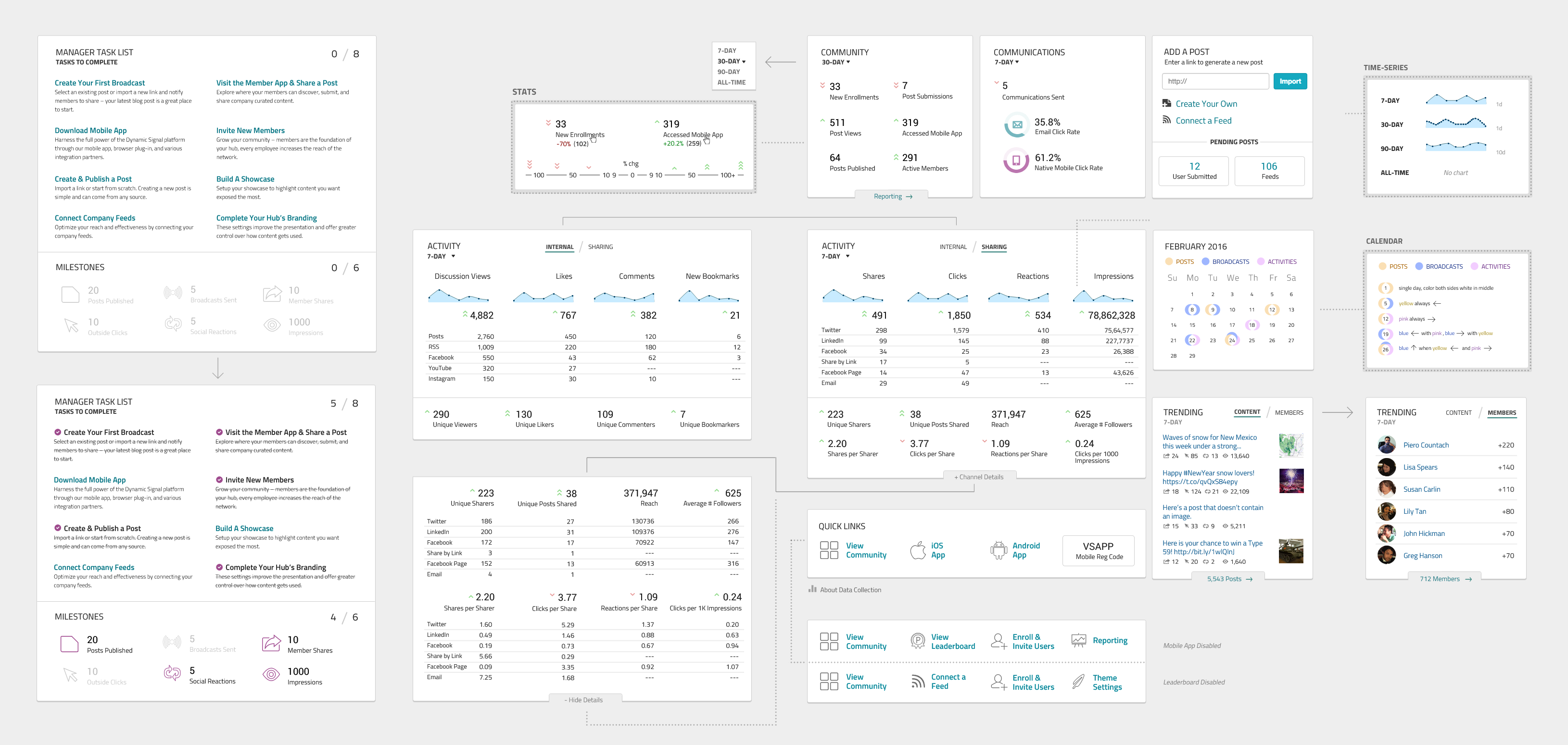 Later on, we’d refocus on the dashboard and the various “tasks” which would increase the likelihood of an engaged community. These tasks doubled as on boarding for new community managers and provided incentive for them to get things up and running. Below you’ll see an exploded view of this dashboard and a condensed view showing primary indicators.