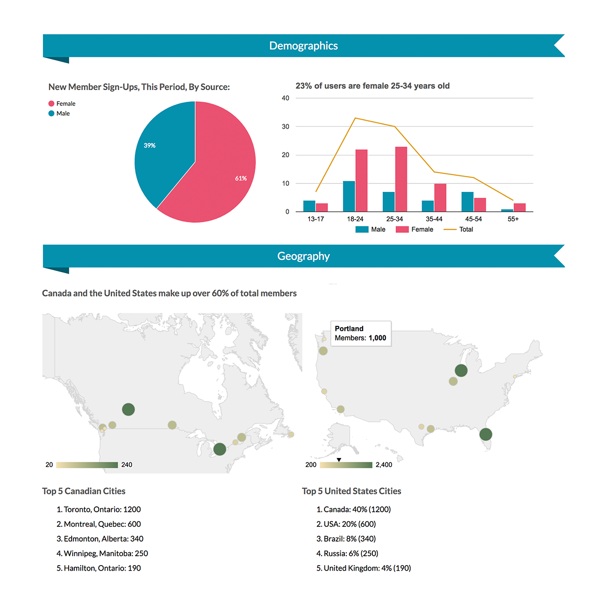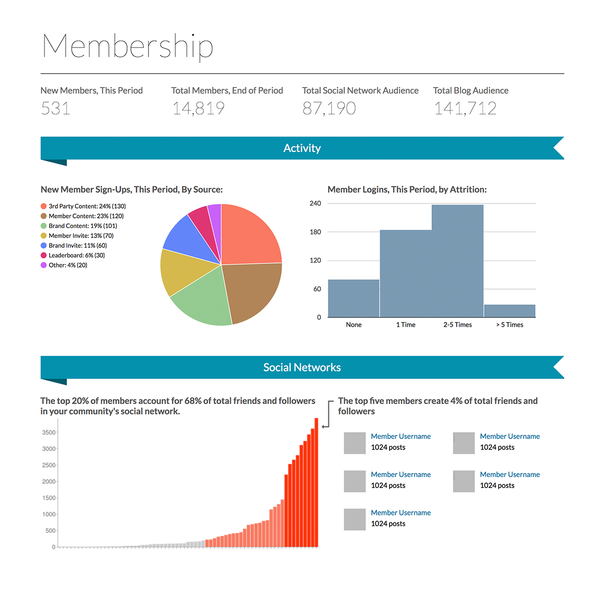 Our first reporting view was initially setup like a printable summary for community managers to show the impact their programs were having. Over time, we’d move to a configurable view where individual charts could be created and exported to be used in those same reports.